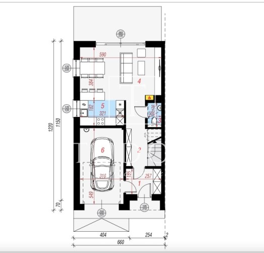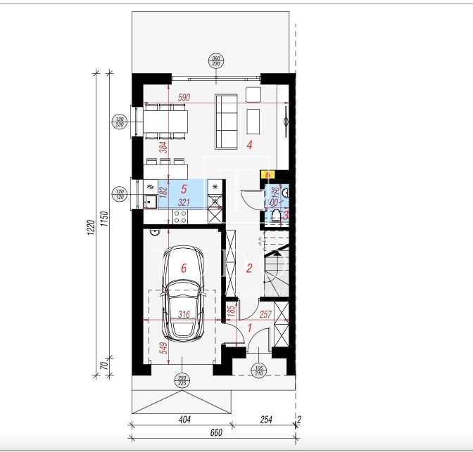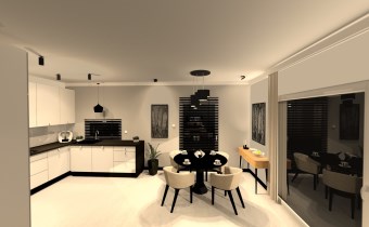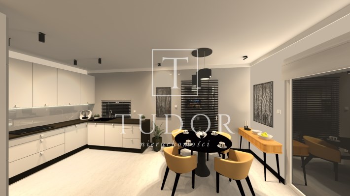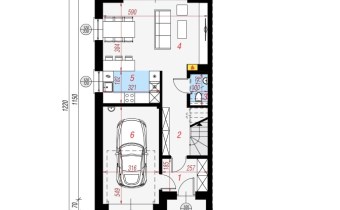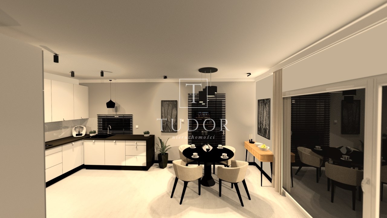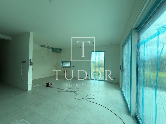 salon połączony z aneksem kuchennym, wyjście na duży taras, wc , z holu przejście do garażu.