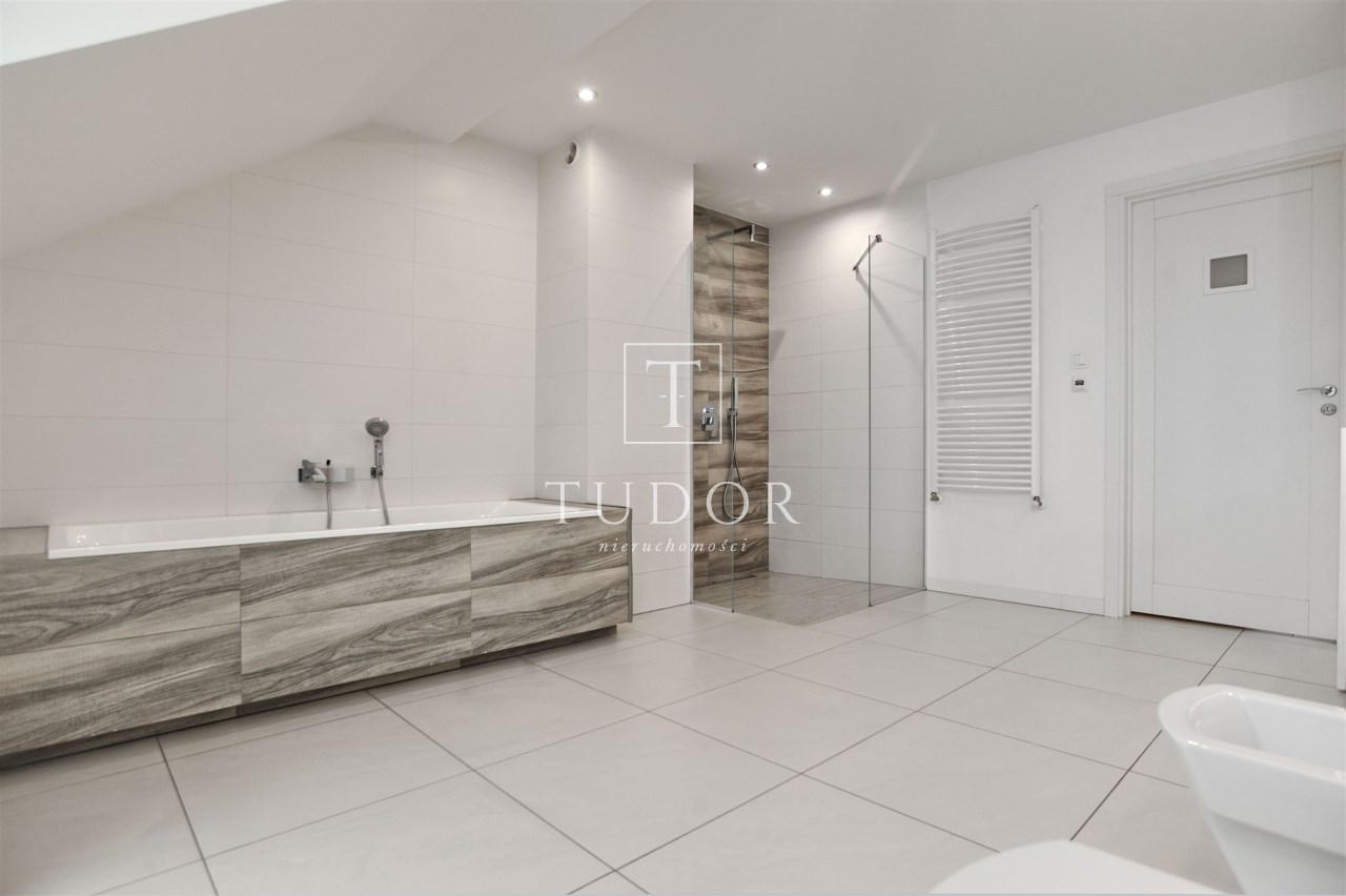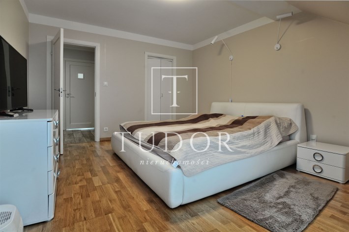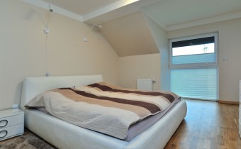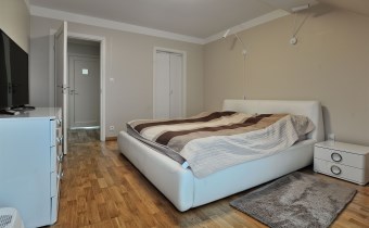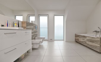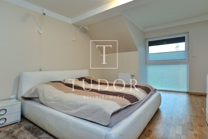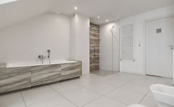 Piętro: trzy komfortowe sypialnie (jedna z garderobą), elegancka łazienka z wanną, prysznicem, bidetem i podwójną umywalką, wyjście na balkon z łazienki i sypialni.