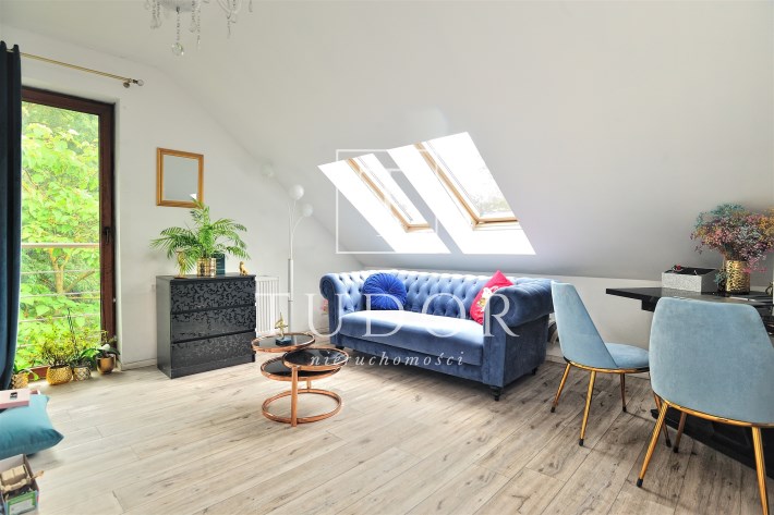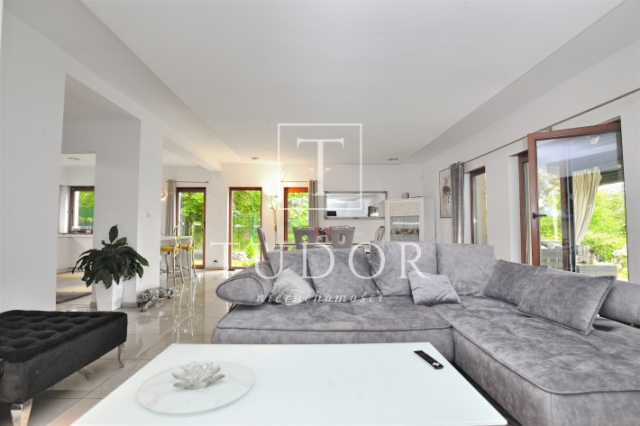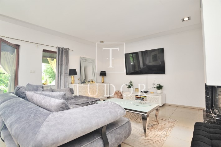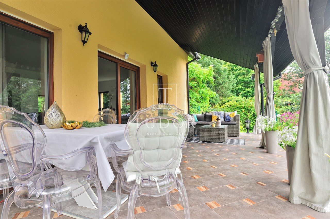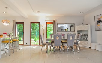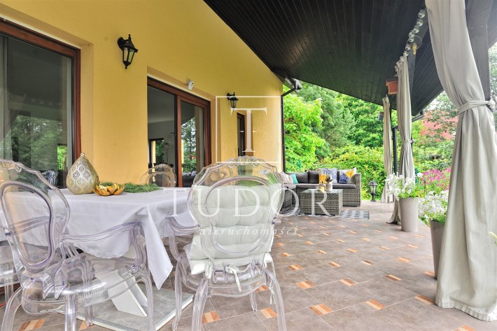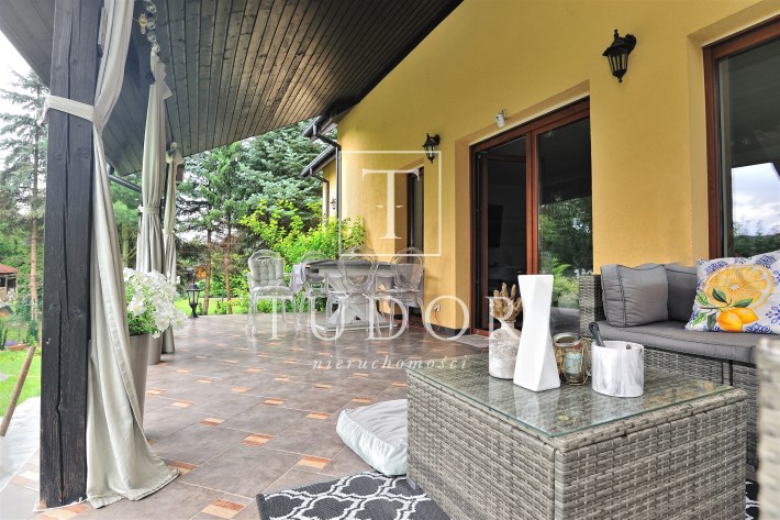Przestronny, jasny salon z wyjściem na zadaszony taras od strony południowej