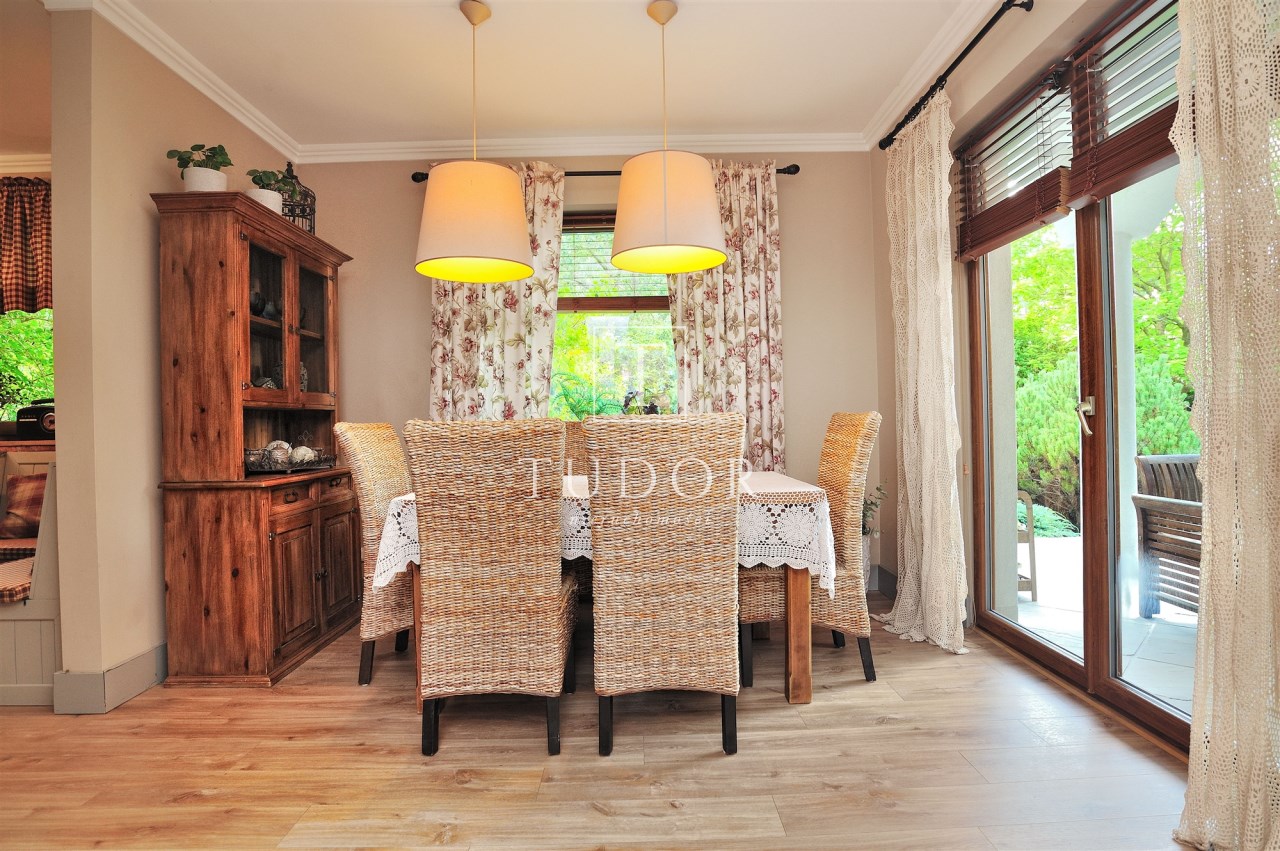 Wnętrza zostały zaprojektowane z myślą o wygodzie domowników. Przestronny, jasny salon z kominkiem stanowi centrum życia rodzinnego. Z salonu prowadzi wyjście na taras i do ogrodu, co sprzyja odpoczynkowi na świeżym powietrzu.