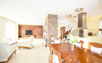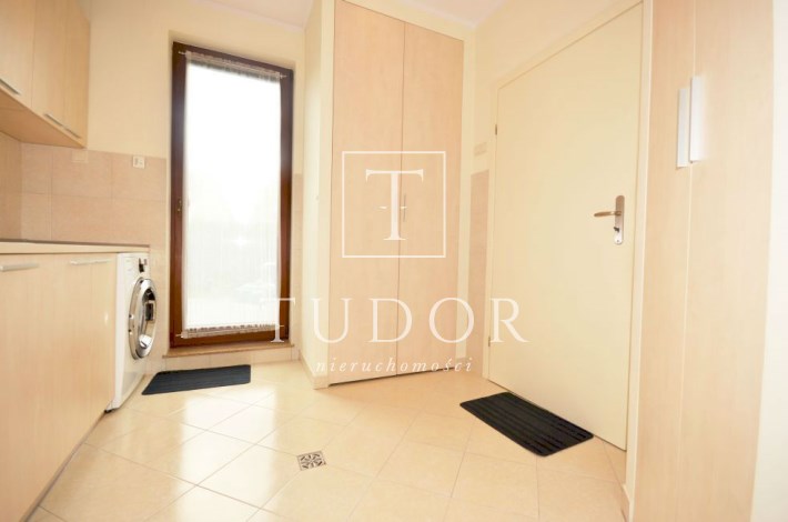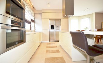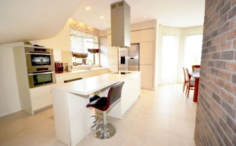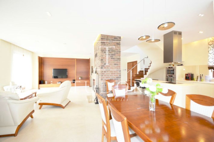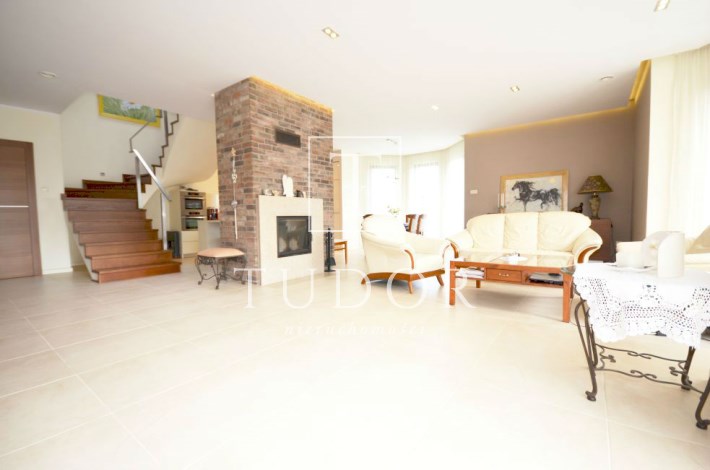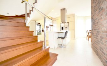 Parter: przestronny salon z jadalnią i otwartą kuchnią w markowej zabudowie (wyposażonej w markowy sprzęt AGD - całość 70m2, łazienki z prysznicem - deszczownica razem z toaletą, garderoby, pomieszczenia gospodarczego z pralnią razem z kotłownią - przejście do garażu dwustanowiskowego (brama automatyczna), przedpokoju oraz hollu.