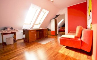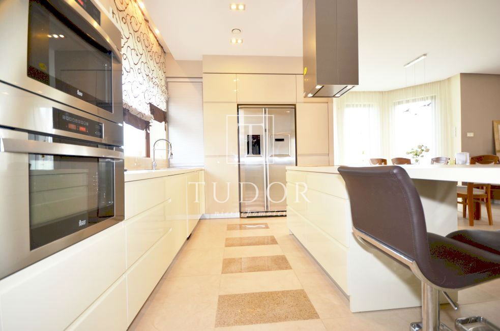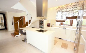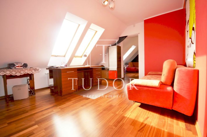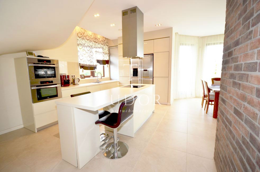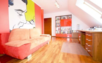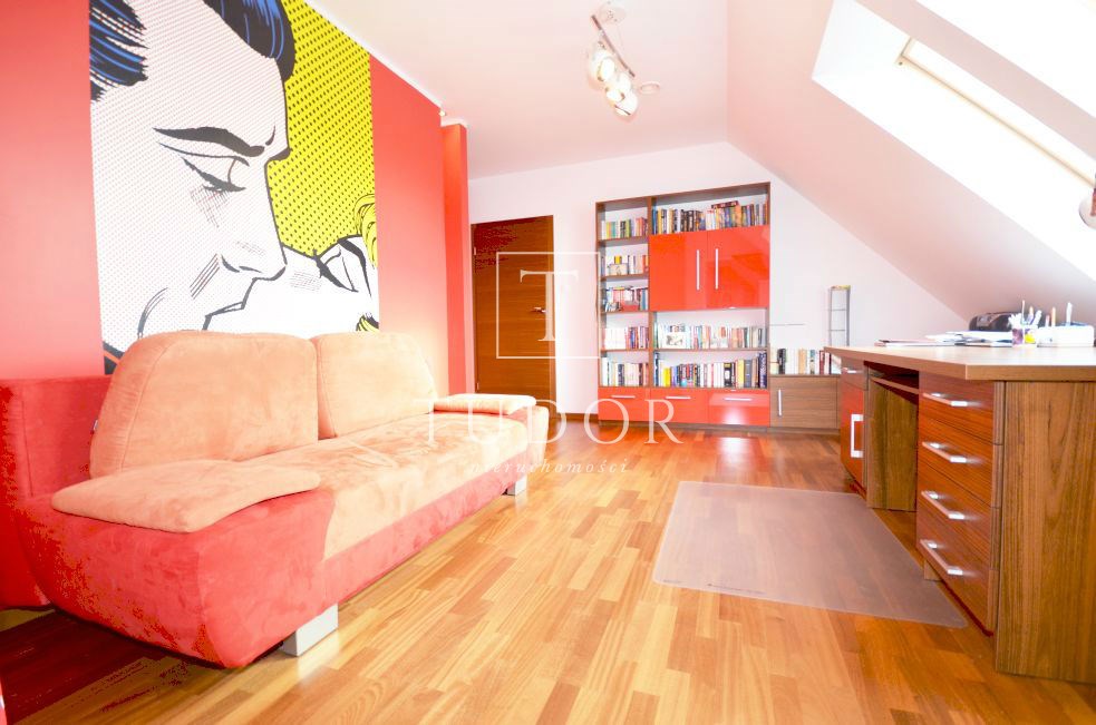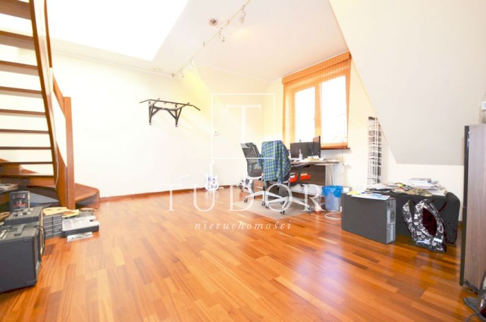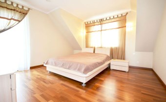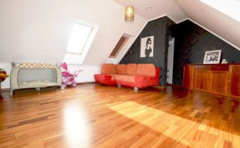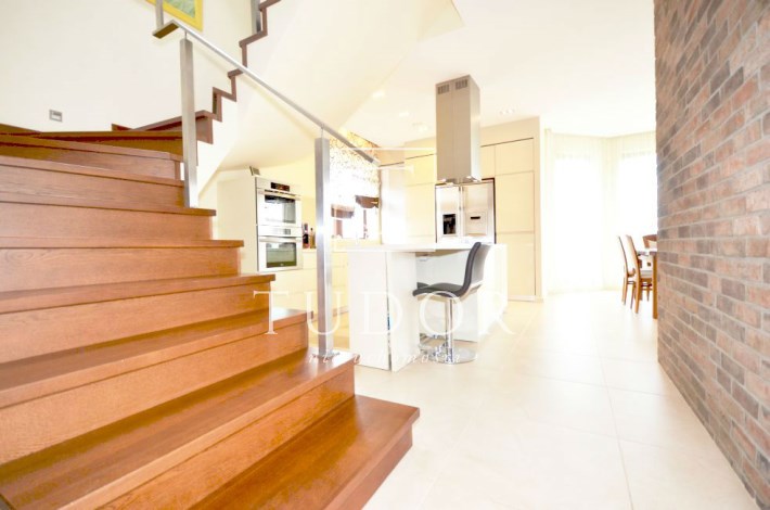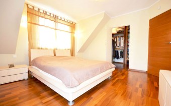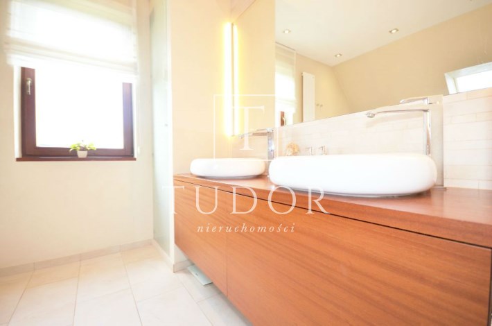Piętro: cztery pokoje/sypialnią: pierwsza sypialnia z wyjściem na balkon - ok. 17m2, garderobą; druga z antresolą i garderobą - 27m2, trzecia sypialnia z przejściowa do czwartej z własną garderobą - całość 35m2, główna łazienka z wanną, dwoma zlewami, kilkoma zabudowami na ręczniki - ok. 11m2, przedpokój. Nieruchomość wykończona w bardzo nowoczesny sposób, przy zastosowaniu wysokiej klasy materiałów.