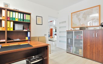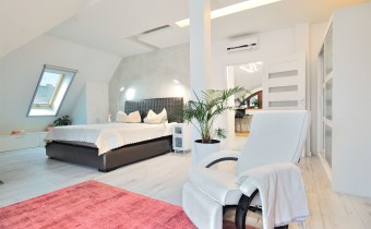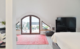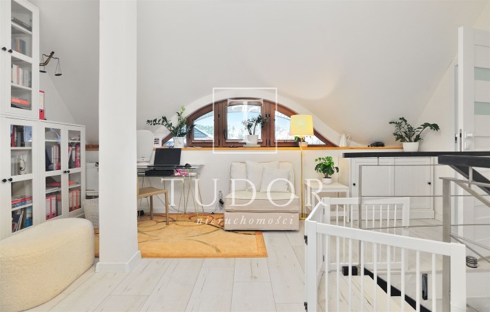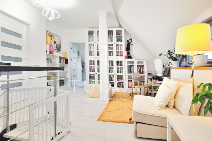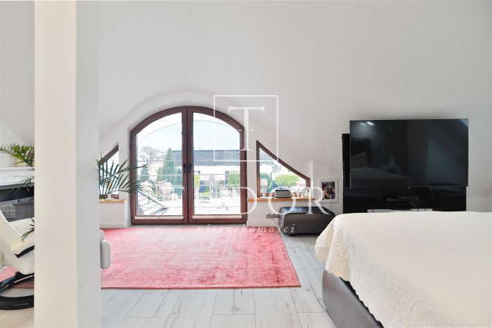 Pietro: sypialnia z oknem na ogród i garderobą, pokoj, zagospodarowany hol w z biblioteką i drugim biurem, oraz pokój kąpielowy.