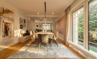 - otwarta jadalnia z dużym stołem i kominkiem