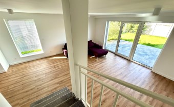 Dom wykończony w jasnych, nowoczesnych barwach, z dużymi przeszkleniami i ogrzewaniem podłogowym w całym budynku.