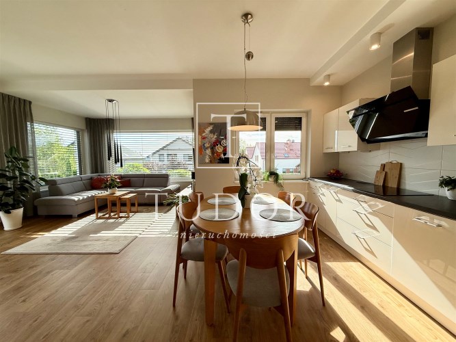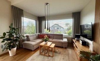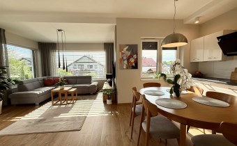 • Salon z aneksem kuchennym 36m2 – jasny, przestronny, z bezpośrednim wyjściem na taras i ogród