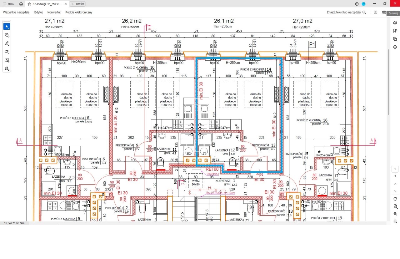 Mieszkanie o jednostronnej, zachodniej ekspozycji okien. Powierzchnia użytkowa wg. dokumentacji projektowej to 26,10 m2.