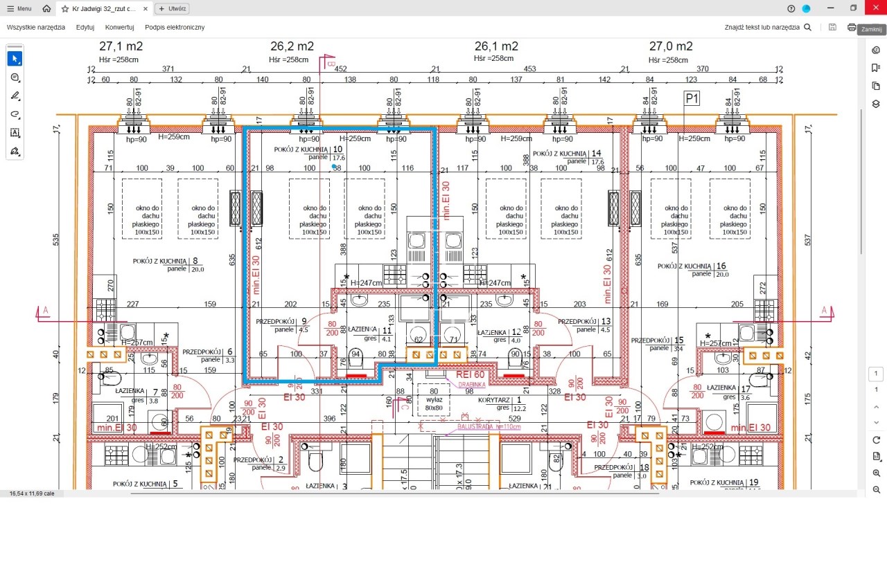 Mieszkanie o jednostronnej, zachodniej ekspozycji okien. Powierzchnia użytkowa wg. dokumentacji projektowej to 26,20 m2.
