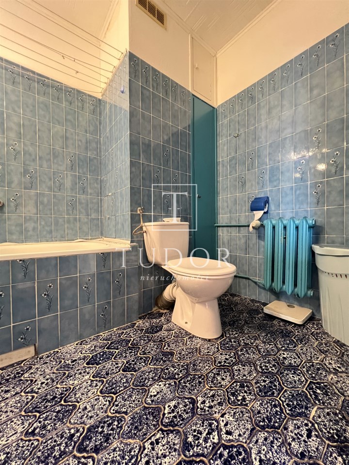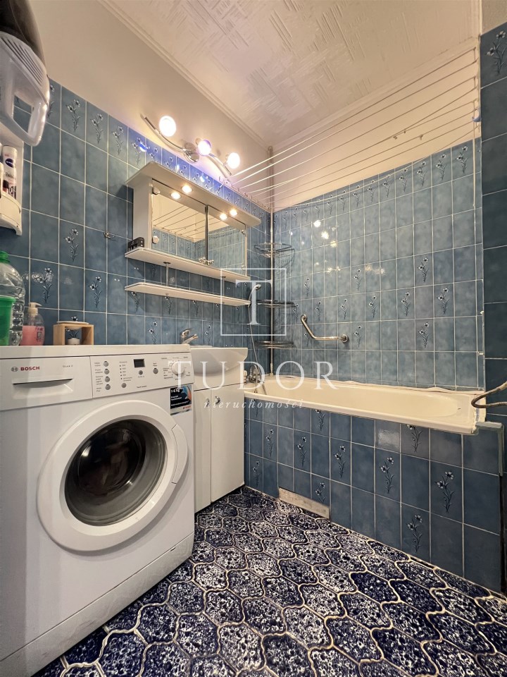 -łazienka wyposażona w wc, umywalkę, wannę oraz pralkę.
