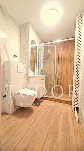 łazienka po remoncie, wyposażona w kabinę prysznicową