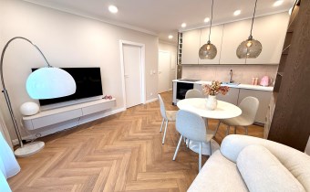 • Salonu z aneksem kuchennym (17,66 m²) który tworzy otwartą, jasną przestrzeń z wygodną sofą, częścią jadalną oraz w pełni wyposażonym aneksem kuchennym,