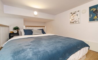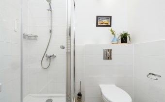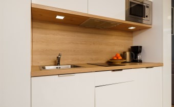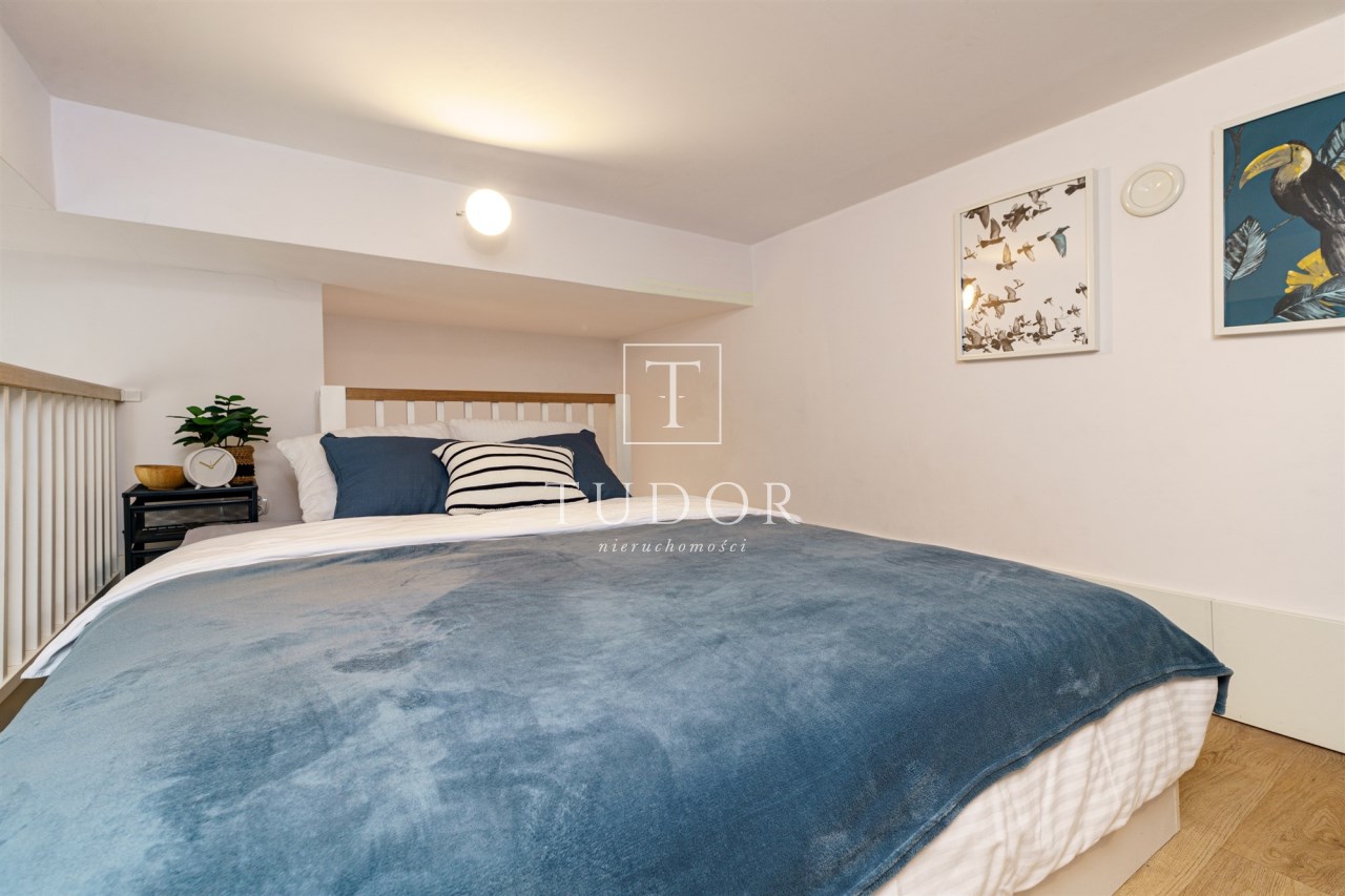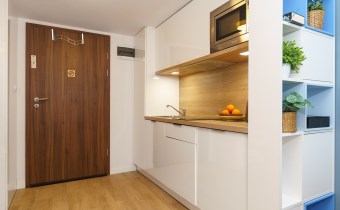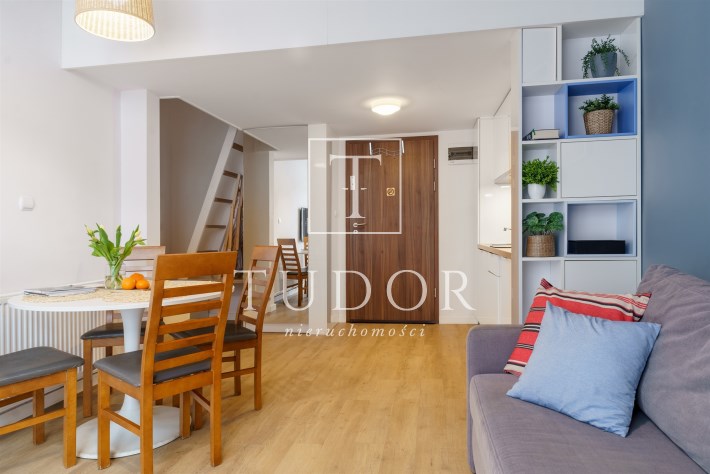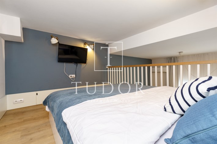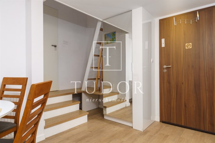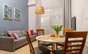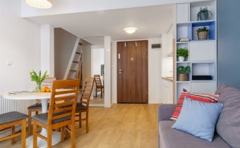 Funkcjonalne studio z antresolą zostało zaprojektowane z myślą o maksymalnym komforcie gości. Na antresoli znajduje się dwuosobowe łóżko oraz telewizor, natomiast w części dziennej – rozkładana sofa, stół z krzesłami oraz drugi telewizor. Lokal pomieści 4 osoby, co znacząco zwiększa jego potencjał najmu. Do dyspozycji jest również w pełni wyposażony aneks kuchenny (lodówka, płyta kuchenna, pochłaniacz i kuchenka mikrofalowa). Całość uzupełnia balkon z bocznym widokiem na morze.