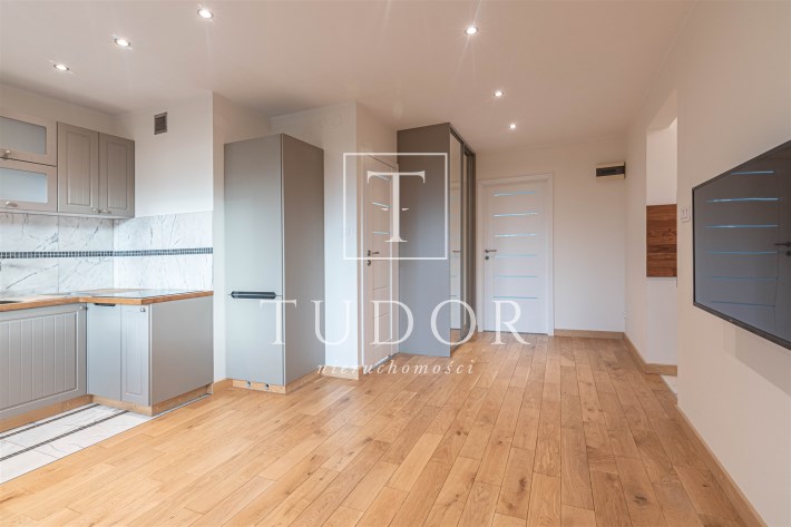 Kuchnia w formie aneksu umeblowana i wyposażona w sprzęt AGD: płyta indukcyjna, piekarnik elektryczny, zabudowana kuchenka mikrofalowa, zmywarka oraz nowa, zabudowana lodówka z zamrażalką. Podłoga w części aneksu i fartuch roboczy wykonane z marmuru. Nad aneksem podwieszany sufit, docieplony wełną akustyczną.
