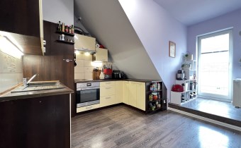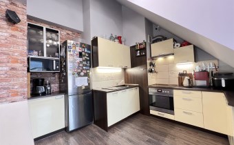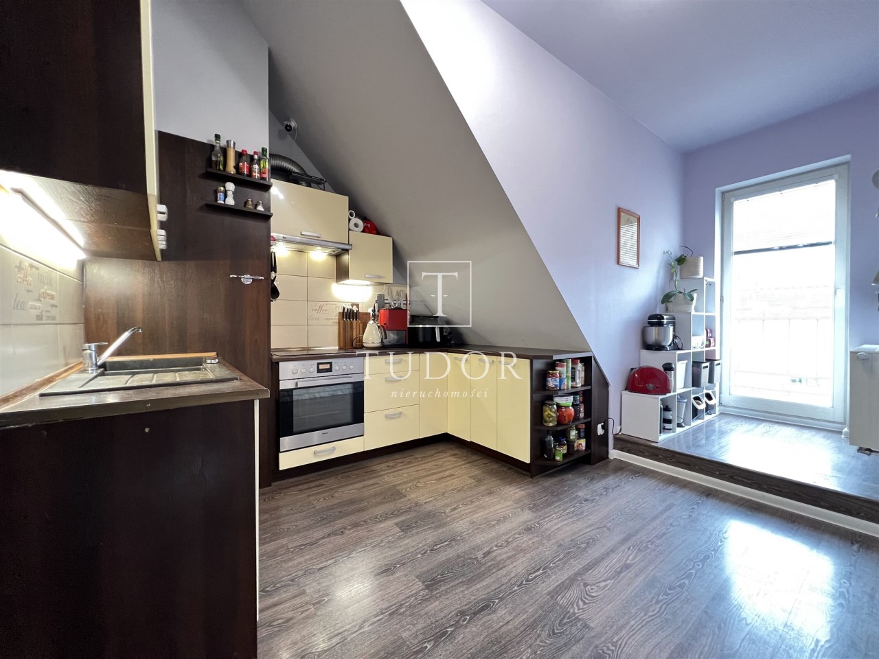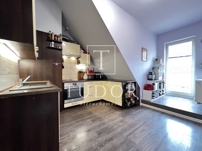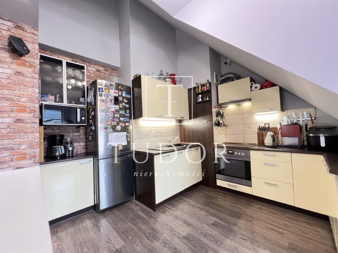 W mieszkaniu pozostają wszystkie zabudowy stałe, w pełni wyposażona kuchnia, pralka w łazience oraz umeblowane dwa pokoje na antresoli.