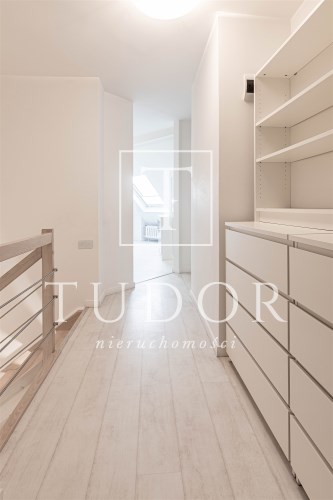 Mieszkanie w bardzo dobrym standardzie, na podłogach panele, okna PCV, na wyższych poziomach drewniane, połaciowe. Ściany gładzone, malowane. Schody prowadzące na kolejne poziomy z litego drewna. Stolarka drzwiowa wewnętrzna, bezprzylgowa z zamkami magnetycznymi. Powierzchnia całkowita mieszkania to 150,00 m2.