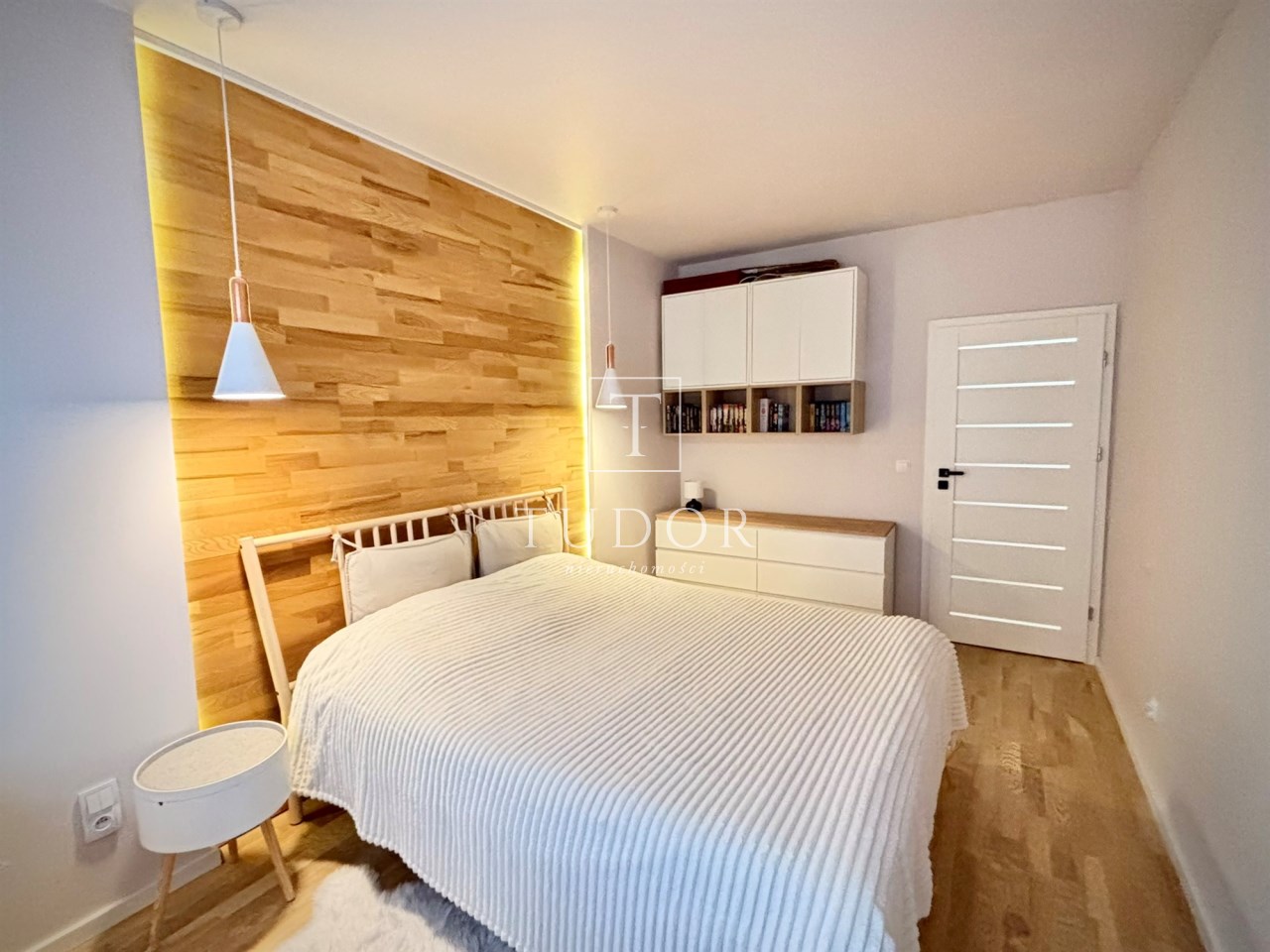 Sypialnia z łóżkiem o szerokości 160 cm, toaletką z lustrem i szafkami do przechowywania. Ma okno od strony północnej. Na podłodze deska drewniana trójwarstwowa.