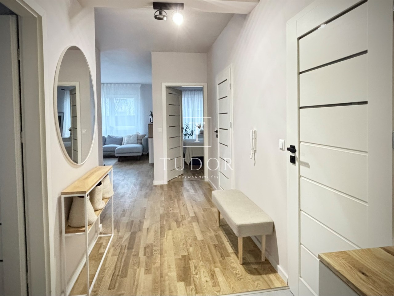 Korytarz wyposażony w wysoką szafę oraz szafkę na buty. Znalazło się tu także wygodne siedzisko oraz konsola z dekoracyjnym lustrem.
