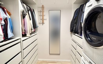 Garderoba z pralką i automatyczną suszarką oraz świetnie zaaranżowaną przestrzenią.