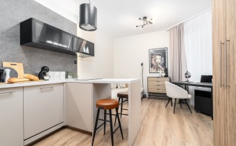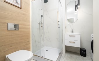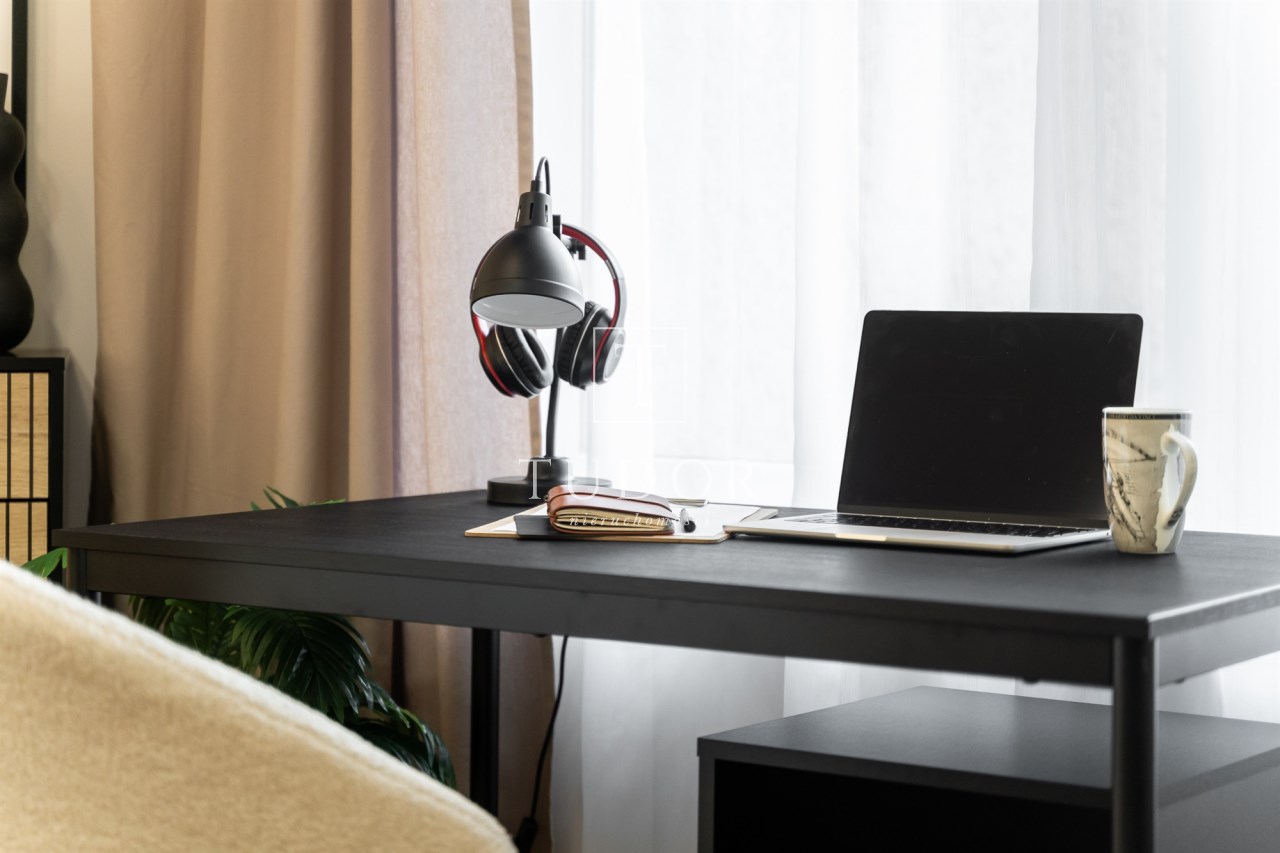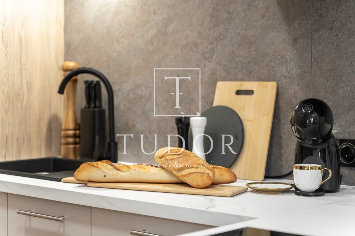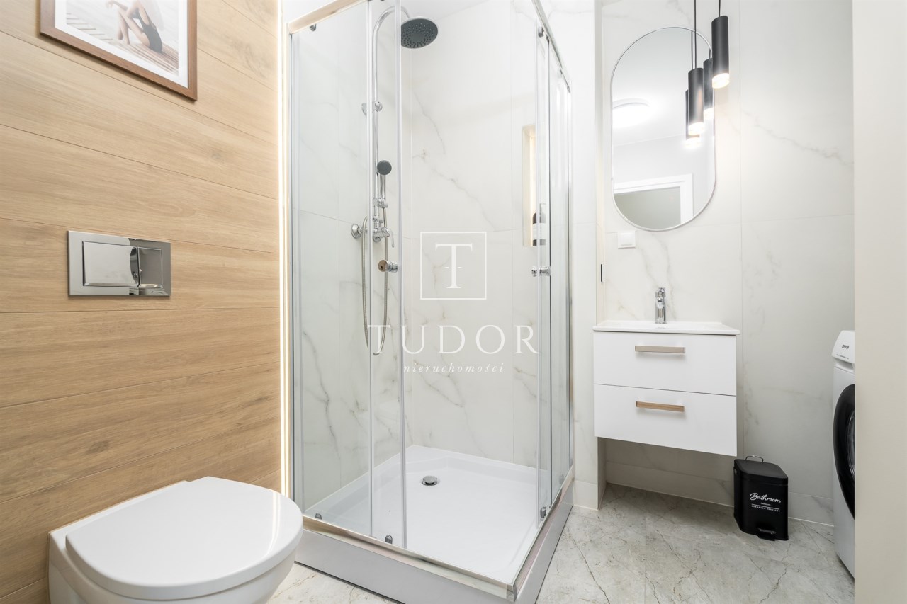 Mieszkanie po remoncie kapitalnym, o południowej ekspozycji okien. Pokój dzienny z aneksem kuchennym, łazienka i korytarz. W pokoju i korytarzu na podłodze panele, ściany wygładzone, malowane. W pokoju wypoczynek, stolik kawowy, biurko, krzesło, komoda, stolik RTV, duża szafa ubraniowa i szafka na buty. Łazienka w glazurze i terakocie, kabina prysznicowa, muszla podwieszana typu geberit, umywalka, meble łazienkowe, lustro, pralka. Kuchnia kompletnie umeblowana i wyposażona: barek, dwa stołki barowe, duża lodówka z zamrażalnikiem, lodówka, płyta elektryczna, okap, zmywarka, mikrofala.