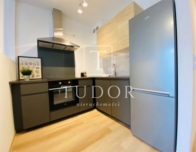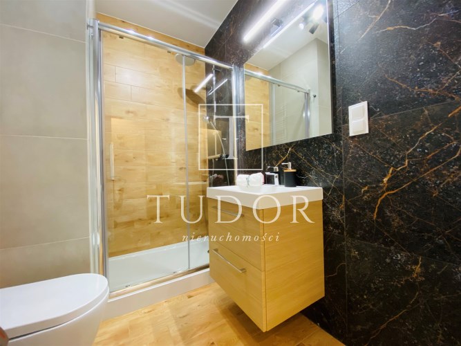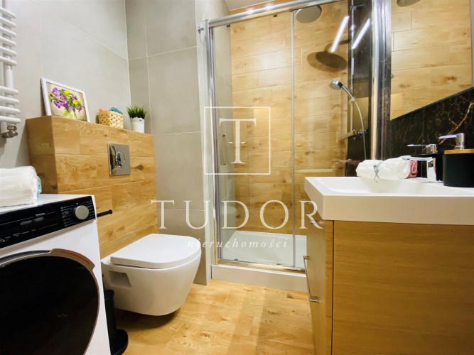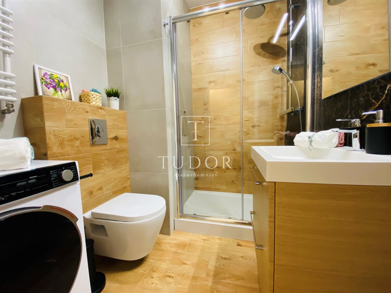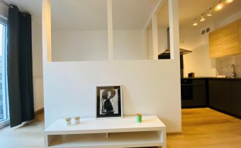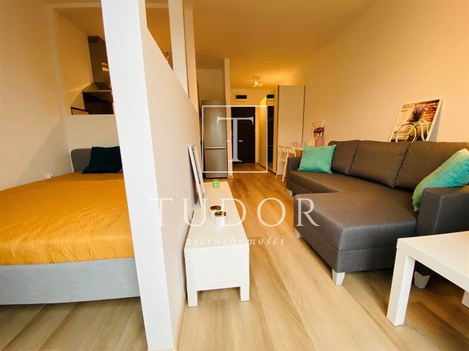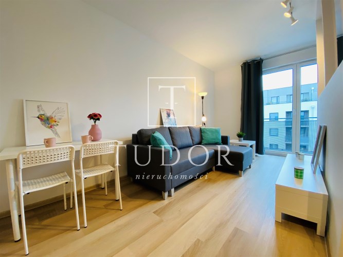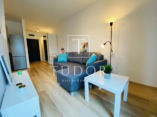 Mieszkanie jest bardzo funkcjonalne. Składa się z salonu z wyjściem na słoneczny balkon, oddzielnej, otwartej kuchni, wydzielonej sypialni, łazienki z WC, kabiną prysznicową, umywalką i pralką oraz przedpokoju z dużą szafą. Kuchnię wyposażono w nowe meble i sprzęty w zabudowie stałej. Mieszkanie jest w pełni wyposażone - wszystkie meble i sprzęty widoczne na zdjęciach pozostają do dyspozycji najemcy. Niewątpliwym atutem jest usytuowanie względem stron świata - okno wychodzące na zachód sprawia, że mieszkanie jest bardzo jasne i ciepłe.