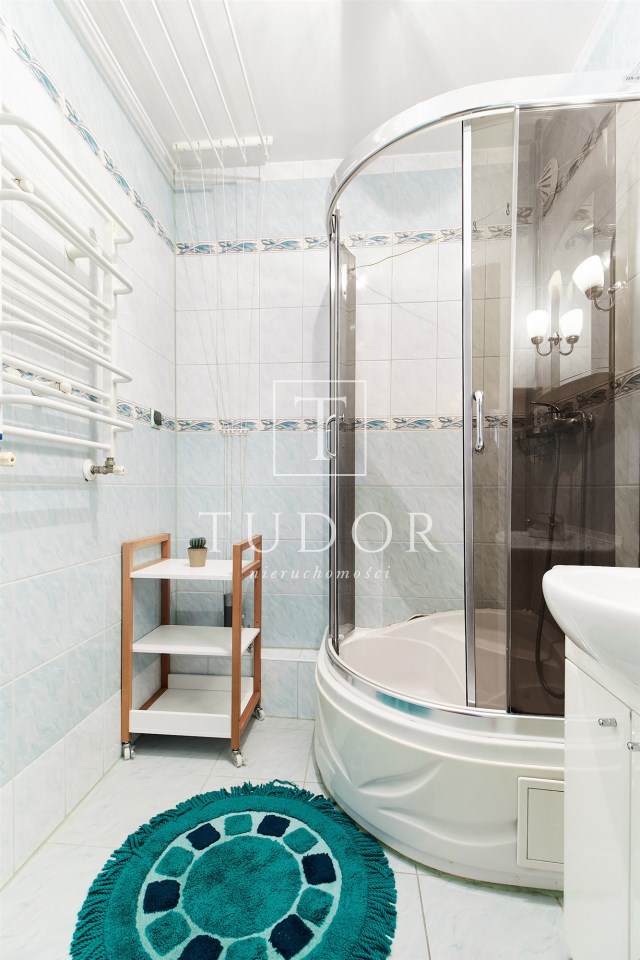 - łazienka z prysznicem + osobne WC (wyposażona w pralkę)