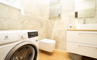 łazienka z kabiną prysznicową, na wyposażeniu pralka.