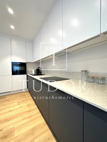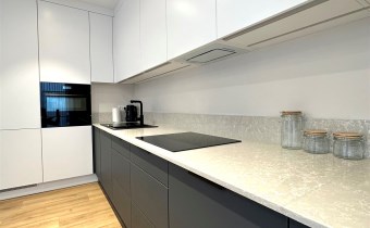 Kuchnia w formie aneksu kuchennego wyposażona w sprzęt AGD (lodówka z zamrażalką, piekarnik z funkcją mikrofalówki, zmywarka, płyta indukcyjna, okap).