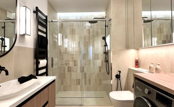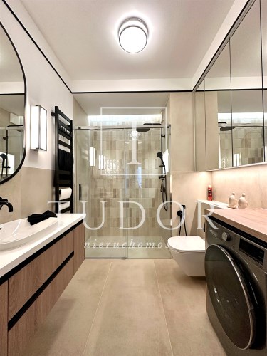 Łazienka razem z toaletą - zabudowa na wymiar, wyposażona w pralko/suszarkę.