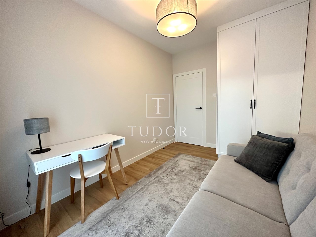 Dodatkowa sypialnia z szafą w zabudowie oraz kanapą.